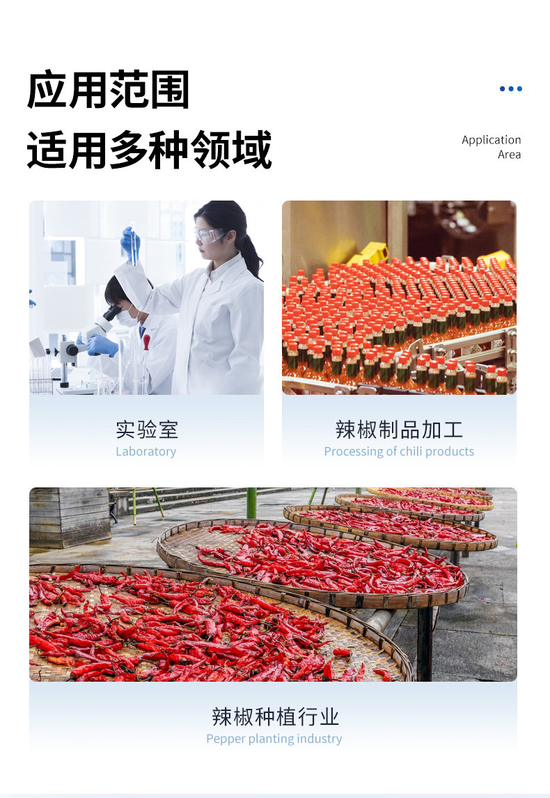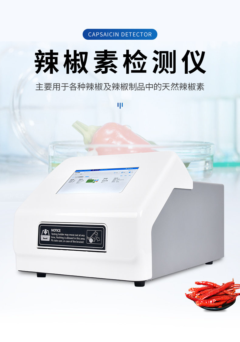 辣椒素檢測(cè)儀主要用于各種辣椒及辣椒制品中的天然辣椒素、辣度檢測(cè)。儀器由亮度發(fā)光二管光源、比色池、高靈敏度集成光電池、微處理器、漢字大屏幕液晶屏、嵌入式微型熱敏打印機(jī)集成芯片構(gòu)成,可直接在大屏幕液晶屏上顯示出被測(cè)樣品中相關(guān)指標(biāo)的含量,并打印出分析結(jié)果,還可以通過(guò)計(jì)算機(jī)接口將數(shù)據(jù)傳輸?shù)诫娔X進(jìn)行數(shù)據(jù)分析。