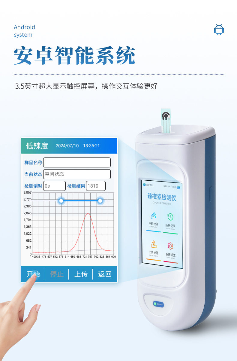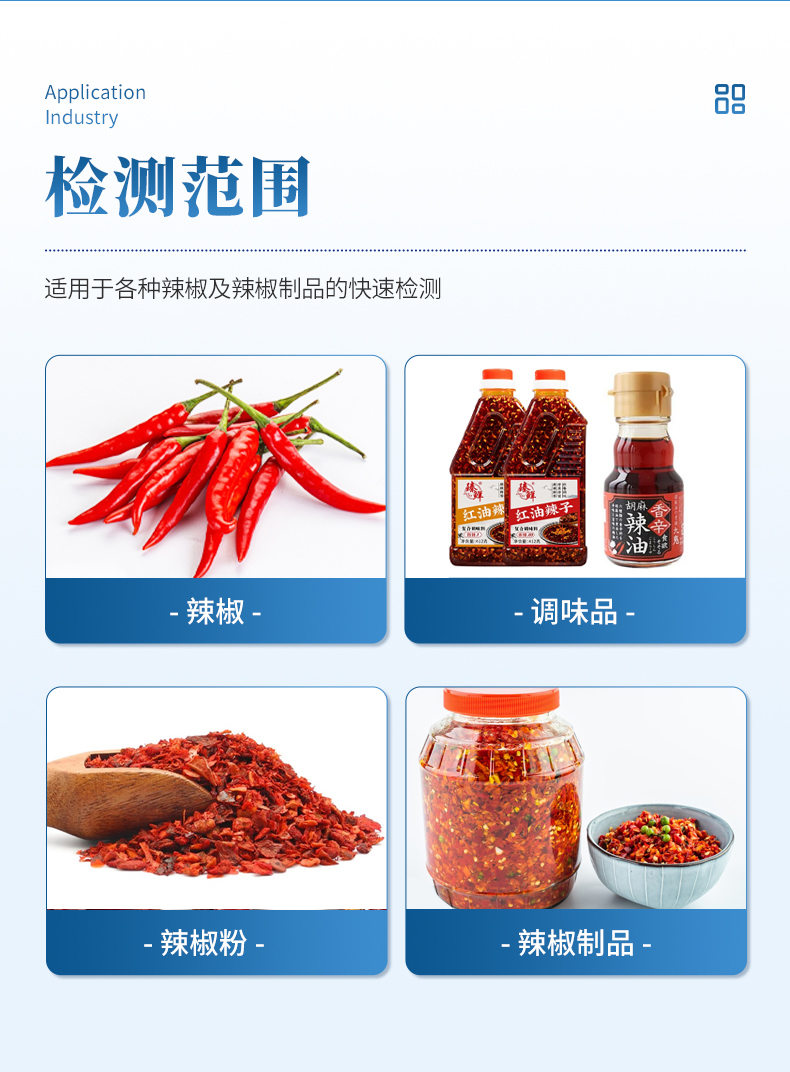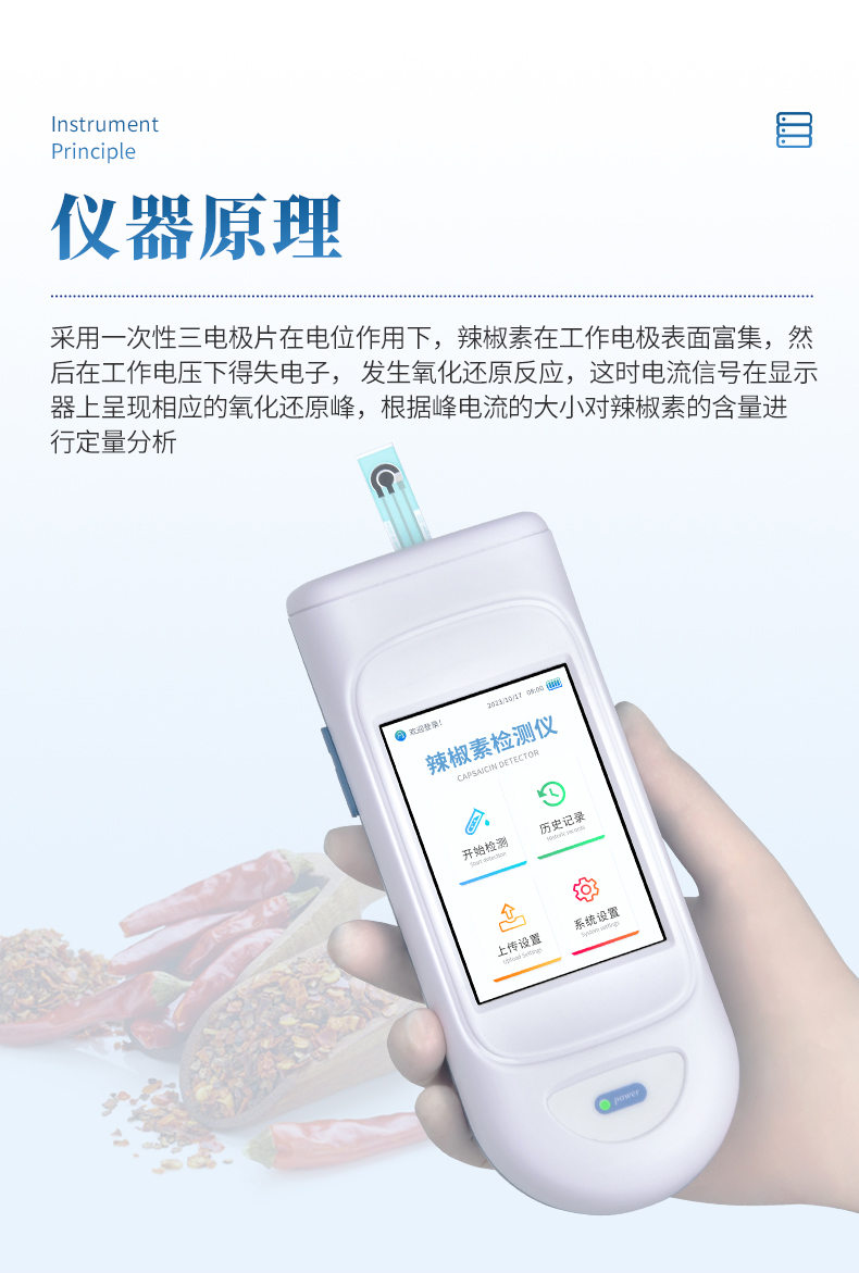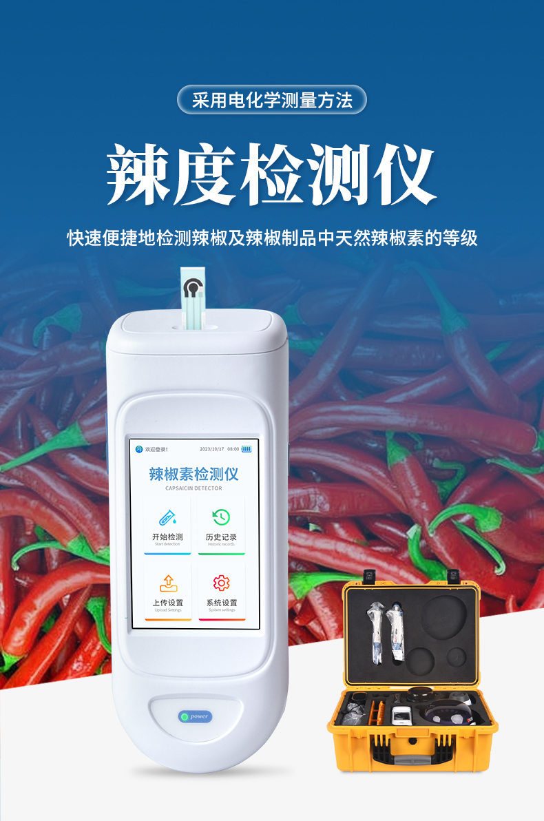 手持式辣度檢測儀采用電化學(xué)測量方法,可快速、便捷地檢測各種辣椒及辣椒制品中的天然辣椒素的等級,適用于干辣椒、鮮辣椒、辣椒粉等天然辣椒及其制品的快速檢測。