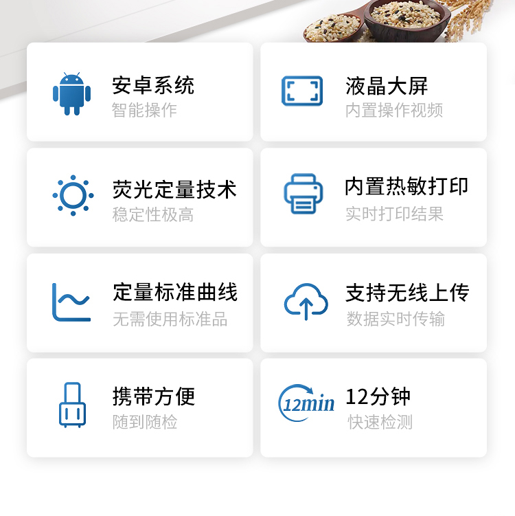 3、內(nèi)置定量標(biāo)準(zhǔn)曲線:儀器內(nèi)置標(biāo)準(zhǔn)曲線,無(wú)需使用標(biāo)準(zhǔn)品,檢測(cè)時(shí)無(wú)需做標(biāo)準(zhǔn)曲線,既節(jié)省了成本,也避免了操作人員與嘔吐毒素的接觸,保護(hù)操作人員的安全;