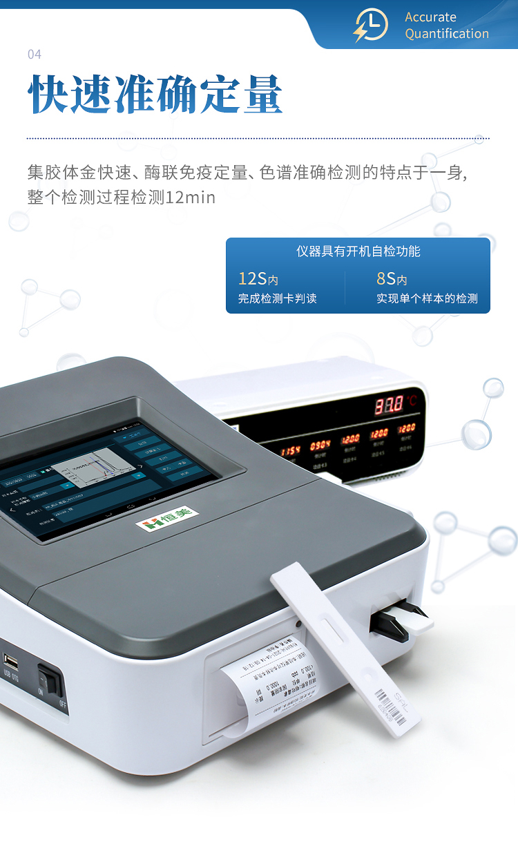 2、快速準(zhǔn)確定量:集膠體金快速,酶聯(lián)免疫定量、色譜準(zhǔn)確檢測(cè)的特點(diǎn)于一身,實(shí)現(xiàn)快速準(zhǔn)確定量檢測(cè);
