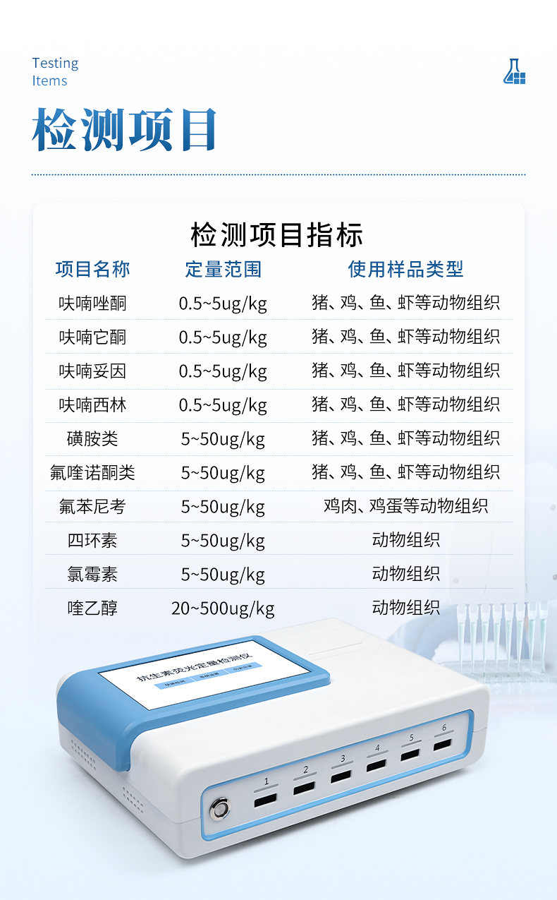 抗生素?zé)晒舛繖z測儀是一款熒光定量檢測食品抗生素的儀器設(shè)備,主要檢測呋喃唑酮、呋喃它酮、呋喃妥因、呋喃西林、磺胺類藥物、氟喹諾酮類、氯霉素、四環(huán)素、氟苯尼考、喹乙醇等畜禽、水產(chǎn)品藥物殘留的定量檢測;樣品前處理簡單,整個檢測過程7min,可以多樣品、多種類同時進行檢測,大大提高批量定量檢測的效率;產(chǎn)品適用于水產(chǎn)養(yǎng)殖流通企業(yè)、農(nóng)業(yè)系統(tǒng)、市場監(jiān)督管理系統(tǒng)、出入境檢驗檢疫、生鮮超市、農(nóng)貿(mào)市場、農(nóng)批市場、食堂、科研單位等行業(yè)。