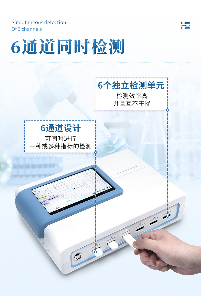 5、6通道設(shè)計,可同時進行一種或多種指標(biāo)的檢測,6個獨立檢測單元,檢測效率高,并且互不干擾;