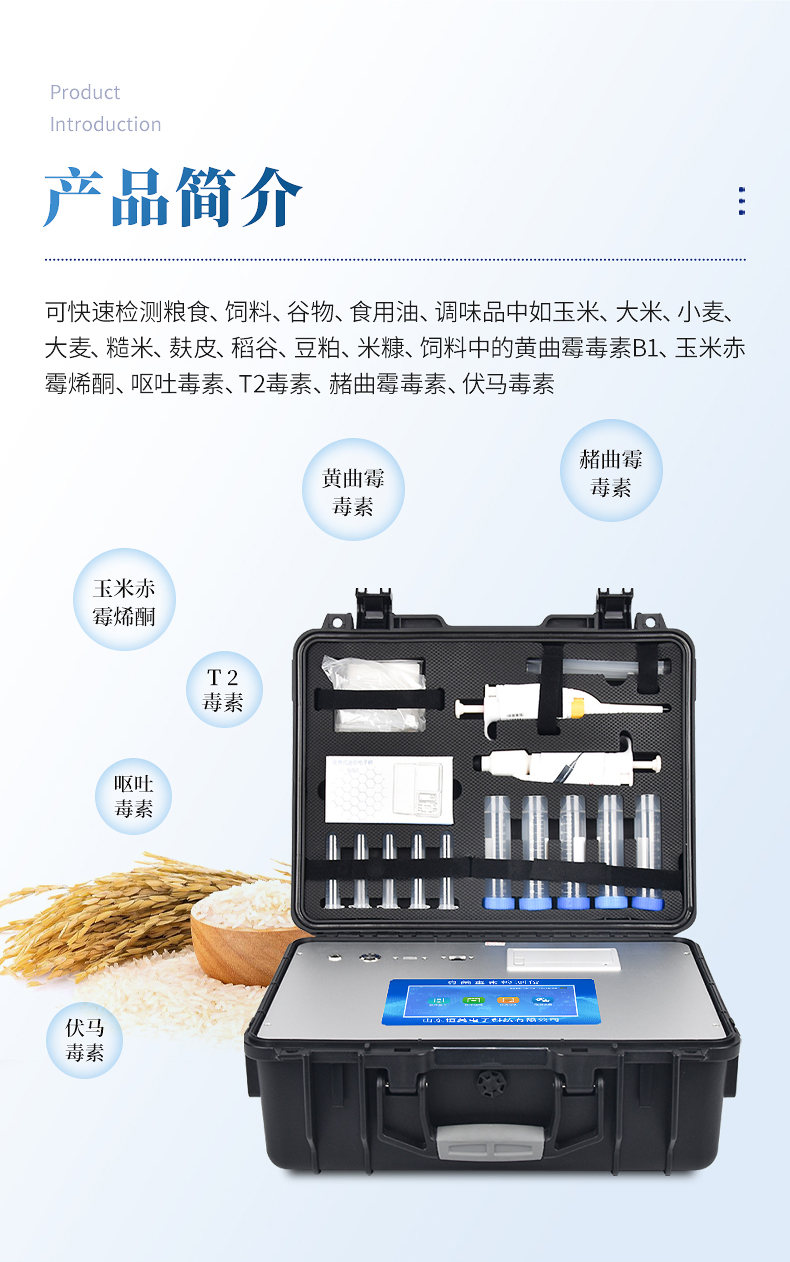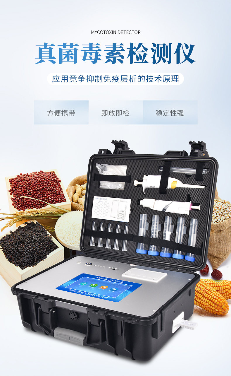 真菌毒素快速檢測儀應用競爭抑制免疫層析的技術(shù)原理,通過就是通過待檢測物與抗體結(jié)合的方法,分析待檢樣品中真菌毒素殘留。可快速檢測糧食、飼料、谷物、食用油、調(diào)味品中如玉米、大米、小麥、大麥、糙米、麩皮、稻谷、豆粕、米糠、飼料中的黃曲霉毒素B1、玉米赤霉烯酮、嘔吐毒素、T2毒素、赭曲霉毒素、伏馬毒素。