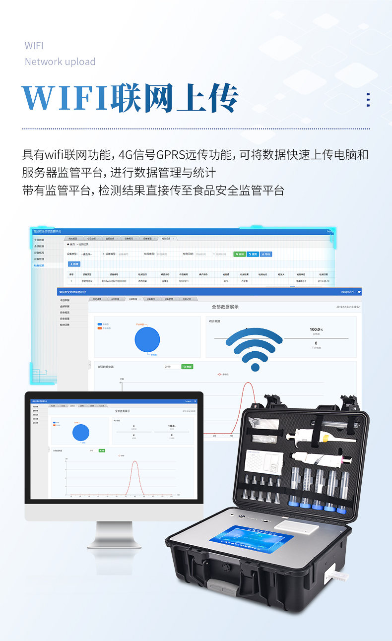 9、儀器帶有監(jiān)管平臺,數(shù)據(jù)可局域網(wǎng)和互聯(lián)網(wǎng)數(shù)據(jù)上傳,檢測結(jié)果直接傳至食品安全監(jiān)管平臺。進行區(qū)域食品安全監(jiān)管及大數(shù)據(jù)分析處理與數(shù)據(jù)統(tǒng)計,檢測區(qū)域食品安全長短期動態(tài),達到食品安全問題預估、預警。