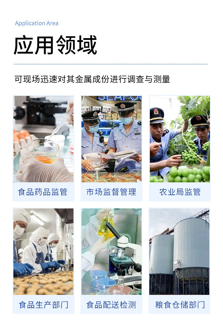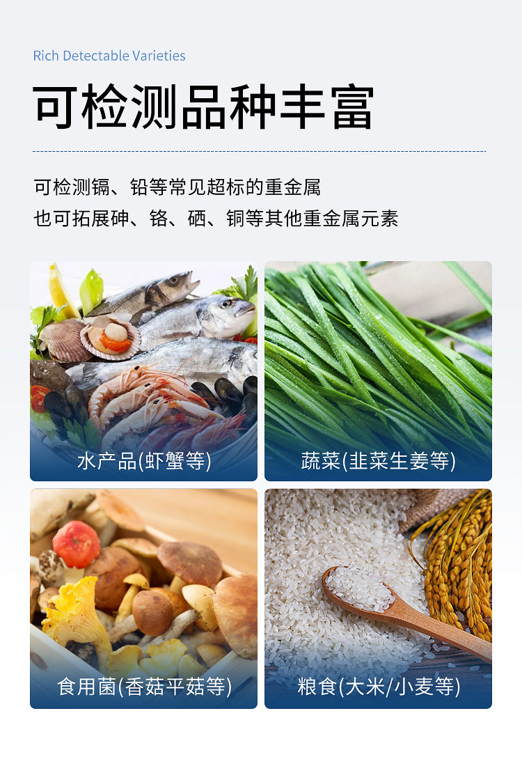 5、應(yīng)用范圍廣,同時(shí)適用于農(nóng)產(chǎn)品、水產(chǎn)品、加工食品的重金屬現(xiàn)場(chǎng)或?qū)嶒?yàn)室快速分析。