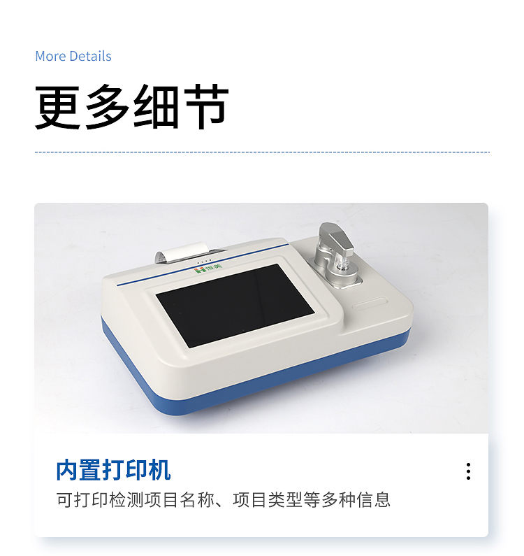 8、儀器內(nèi)置打印機(jī),可打印檢測(cè)項(xiàng)目名稱、項(xiàng)目類型、檢測(cè)結(jié)果、檢測(cè)人員、送檢單位、送檢人員、限量標(biāo)準(zhǔn)等信息;