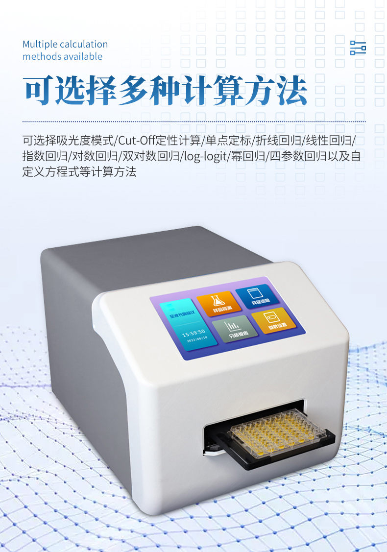 4.可選擇吸光度模式/Cut-Off定性計算/單點定標/折線回歸/線性回歸/指數(shù)回歸/對數(shù)回歸/雙對數(shù)回歸/log-logit/冪回歸,四參數(shù)回歸以及自定義方程式等計算方法