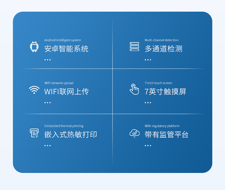 1、安卓智能操作系統(tǒng),采用更加高效和人性化操作,儀器具有網(wǎng)線連接、wifi聯(lián)網(wǎng)上傳、GPRS無線遠傳功能,快速上傳數(shù)據(jù)。