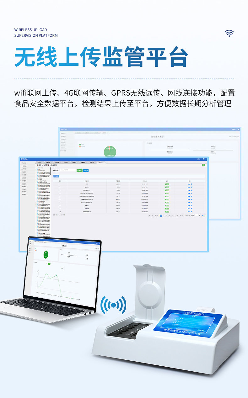 6、儀器帶有監(jiān)管平臺。檢測結(jié)果可直接無線上傳。進行數(shù)據(jù)分析處理,檢測乳制品等長短期動態(tài),達到問題預(yù)估、預(yù)警。