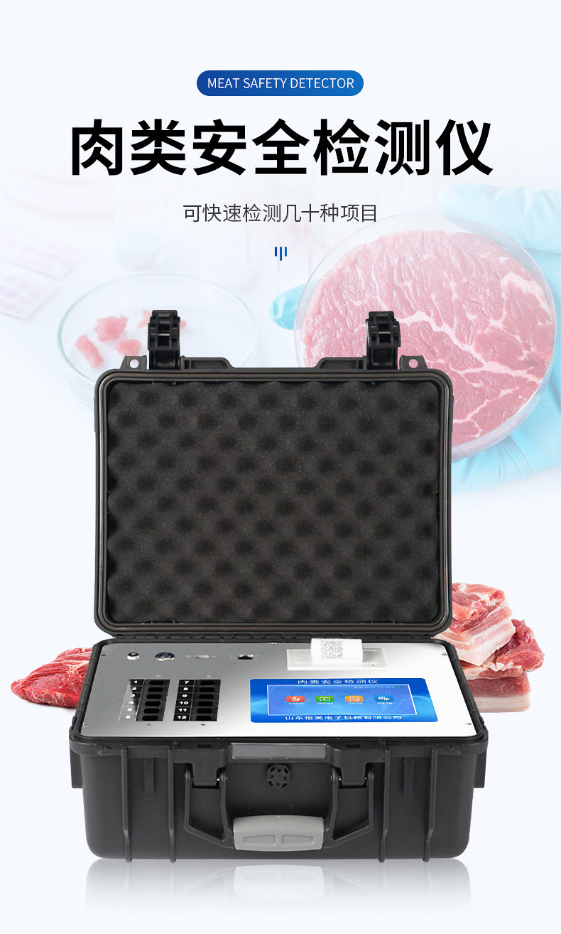 肉制品檢測儀可快速檢測幾十種項(xiàng)目,包含各種獸藥殘留:抗生素類殘留、瘦肉精激素類殘留;病害肉診斷:肉類新鮮度、肉中組胺、揮發(fā)性鹽基氮;水產(chǎn)品安全篩查等現(xiàn)場的定性定量檢測。