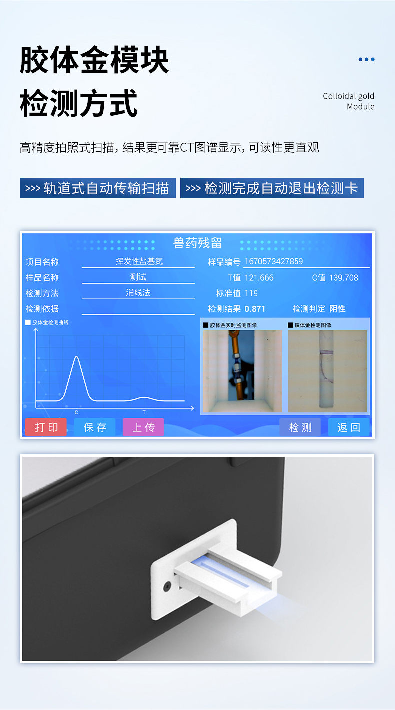 7、膠體金模塊檢測方式:軌道式自動(dòng)傳輸掃描,檢測完成后自動(dòng)退出檢測卡。