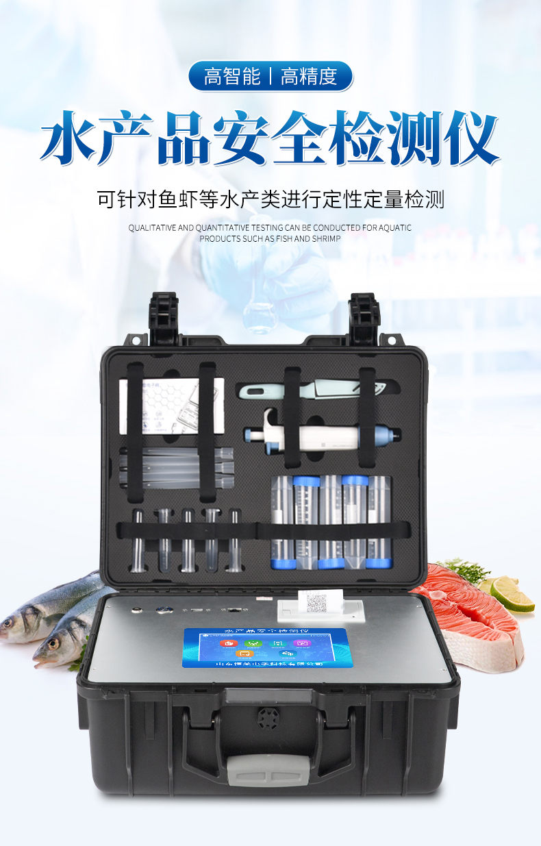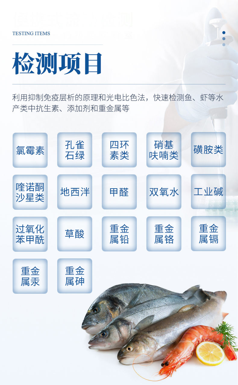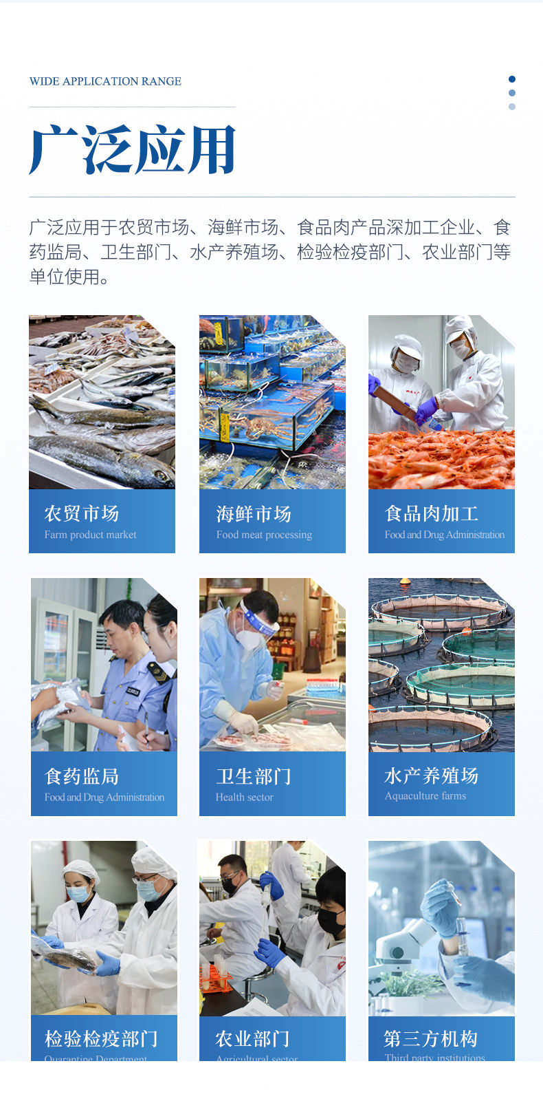 水產(chǎn)品檢測(cè)儀可快速檢測(cè)魚、蝦等水產(chǎn)類中的氯霉素、孔雀石綠、四環(huán)素類、硝基呋喃類、磺胺類、喹諾酮沙星類、氟苯尼考、土霉素、金霉素、甲砜霉素、地西泮等快速檢測(cè),如氯霉素快速檢測(cè)卡整個(gè)檢測(cè)過程只需要30分鐘左右, 靈敏度為 0.3 μg/kg (ppb)。該快速檢測(cè)系統(tǒng)設(shè)備為集成化食品安全快速檢測(cè)分析設(shè)備,廣泛應(yīng)用于農(nóng)貿(mào)市場(chǎng)、海鮮市場(chǎng)、食品肉產(chǎn)品深加工企業(yè)、食藥監(jiān)局、衛(wèi)生部門、水產(chǎn)養(yǎng)殖場(chǎng)、檢驗(yàn)檢疫部門、農(nóng)業(yè)部門、第三方機(jī)構(gòu)等單位使用。