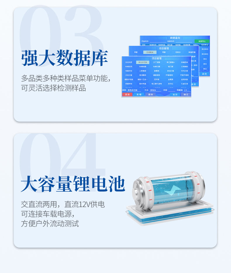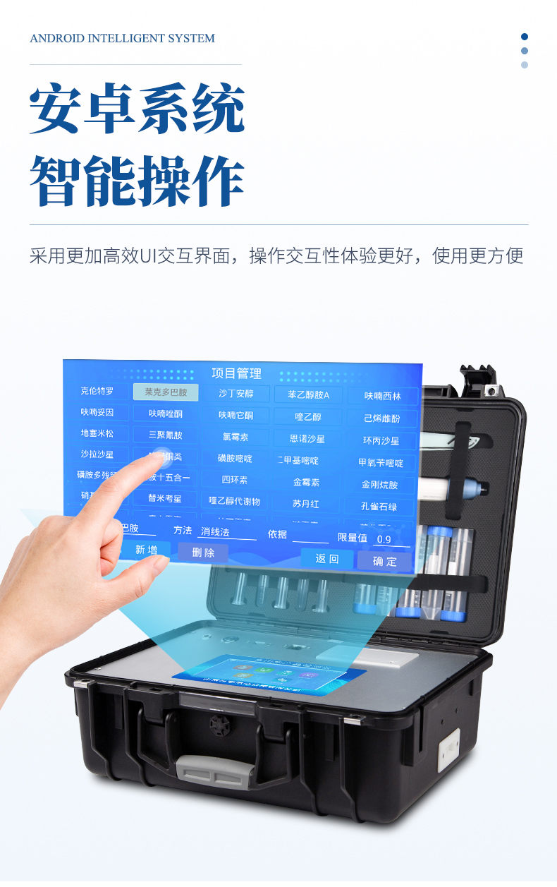 5、一體化便攜式快檢設(shè)備,滿足現(xiàn)場(chǎng)及流動(dòng)檢測(cè)使用需求,能夠在同一軟件下實(shí)現(xiàn)所有檢測(cè)項(xiàng)目的檢測(cè),并可通過同一窗口直觀顯示檢測(cè)結(jié)果。