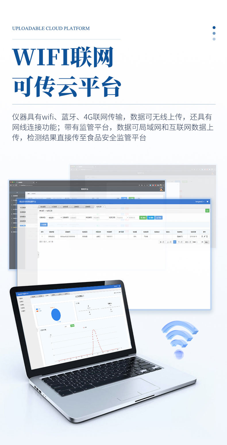 2、儀器具有wifi、藍(lán)牙、4G聯(lián)網(wǎng)傳輸,數(shù)據(jù)可無線上傳,還具有網(wǎng)線連接功能。