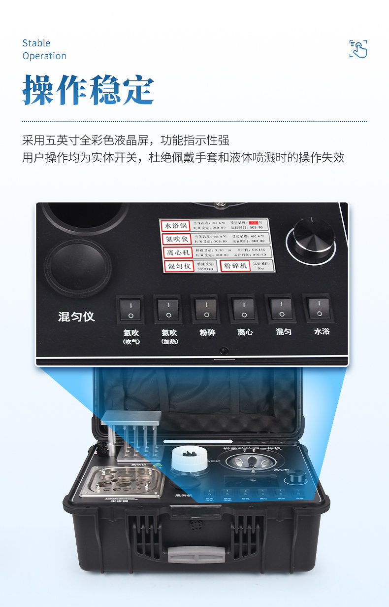 應(yīng)國(guó)內(nèi)用戶的實(shí)際需求,自行研制開發(fā)的新型儀器——QC05型樣品前處理一體機(jī)。樣品前處理集成箱將樣本前處理過程中樣品濃縮、水浴恒溫、離心分層、均質(zhì)、振蕩混勻等步驟所需設(shè)備進(jìn)行集成,僅需一臺(tái)樣品前處理集成箱設(shè)備即可完成所有樣本前處理過程,并且方便攜帶,不僅適用于現(xiàn)場(chǎng)檢測(cè)使用,還可用于色譜、質(zhì)譜等分析樣品的純化和制備。