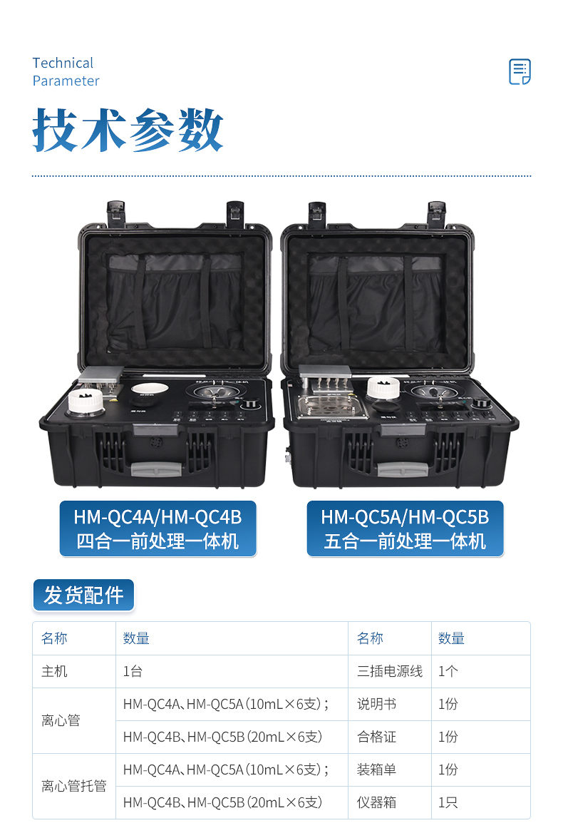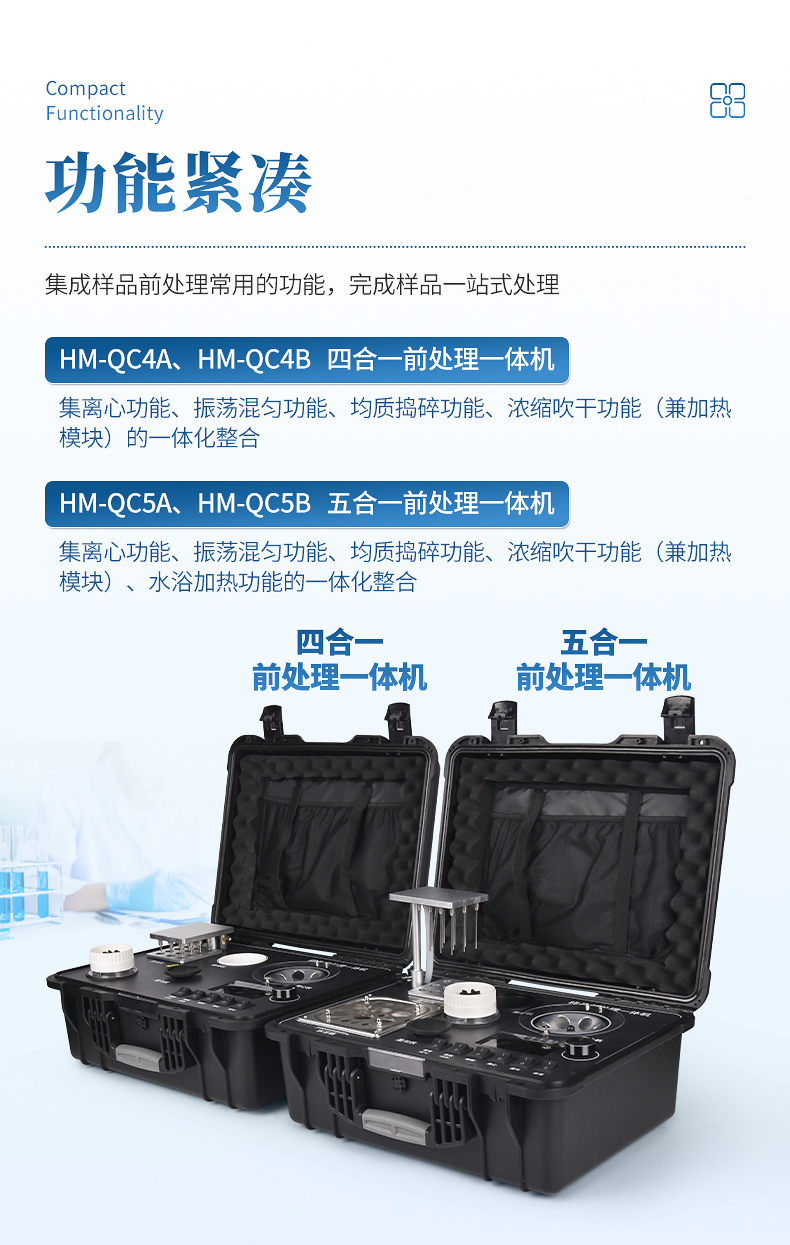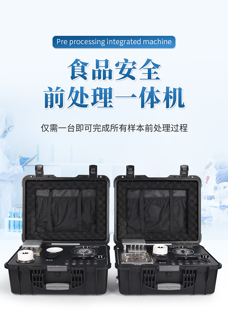 應國內用戶的實際需求,自行研制開發(fā)的新型儀器——QC05型樣品前處理一體機。樣品前處理集成箱將樣本前處理過程中樣品濃縮、水浴恒溫、離心分層、均質、振蕩混勻等步驟所需設備進行集成,僅需一臺樣品前處理集成箱設備即可完成所有樣本前處理過程,并且方便攜帶,不僅適用于現(xiàn)場檢測使用,還可用于色譜、質譜等分析樣品的純化和制備。