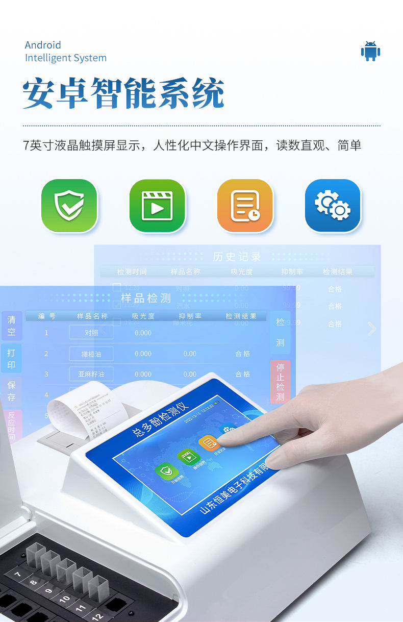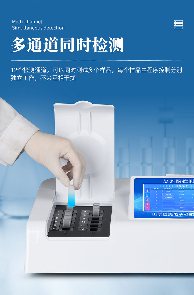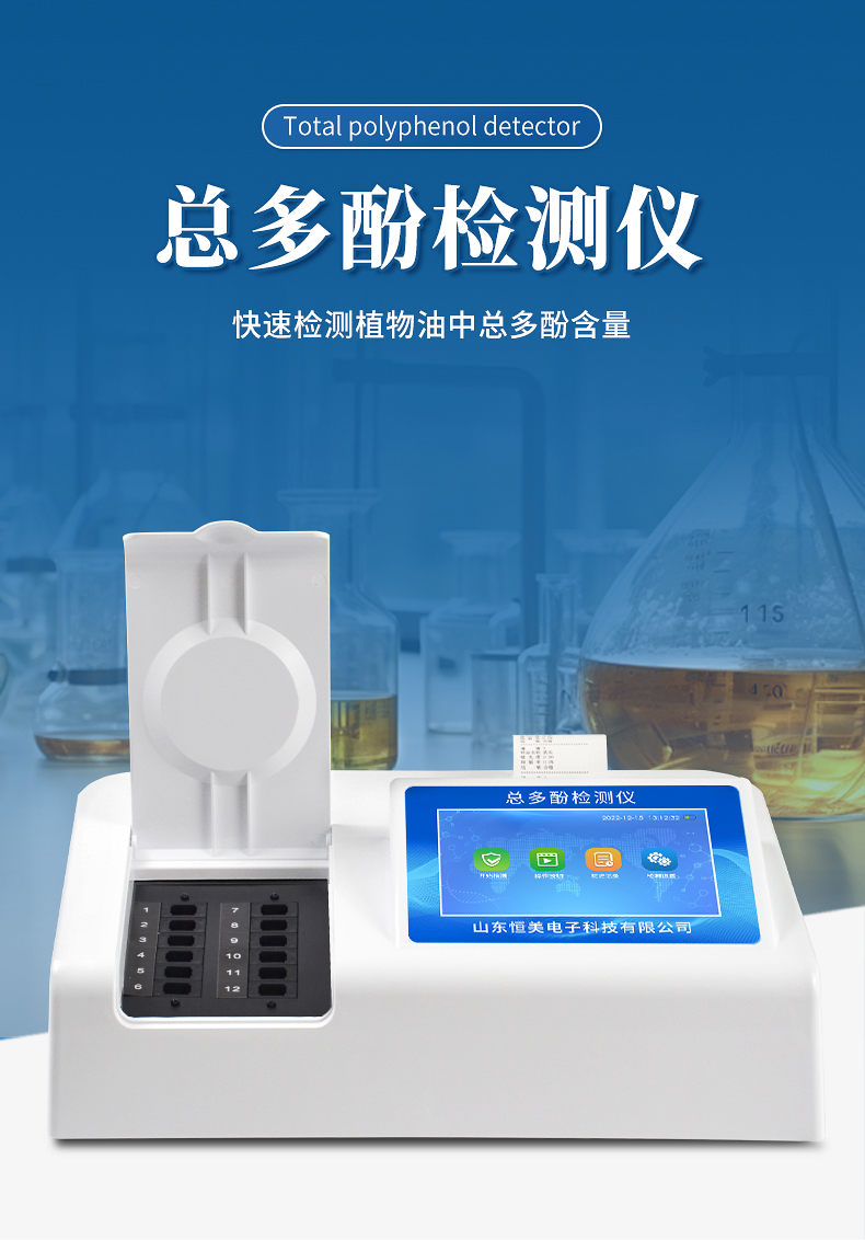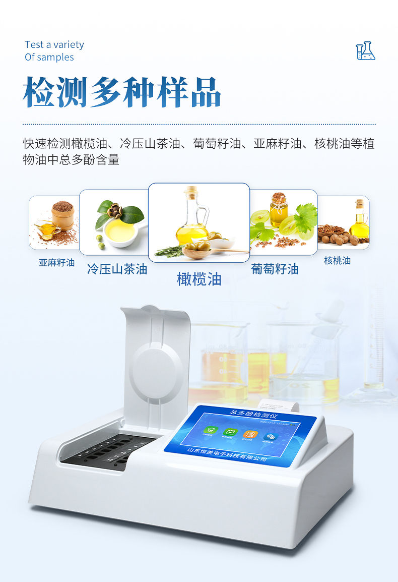 總多酚檢測儀能夠快速檢測橄欖油、冷壓山茶油、葡萄籽油、亞麻籽油、核桃油等植物油中總多酚含量;儀器預(yù)留其他項(xiàng)目檢測程序和端口,根據(jù)日后需求可方便的自主增加檢測項(xiàng)目。日后可升級為檢測水產(chǎn)品、面制品的綜合類型儀器。